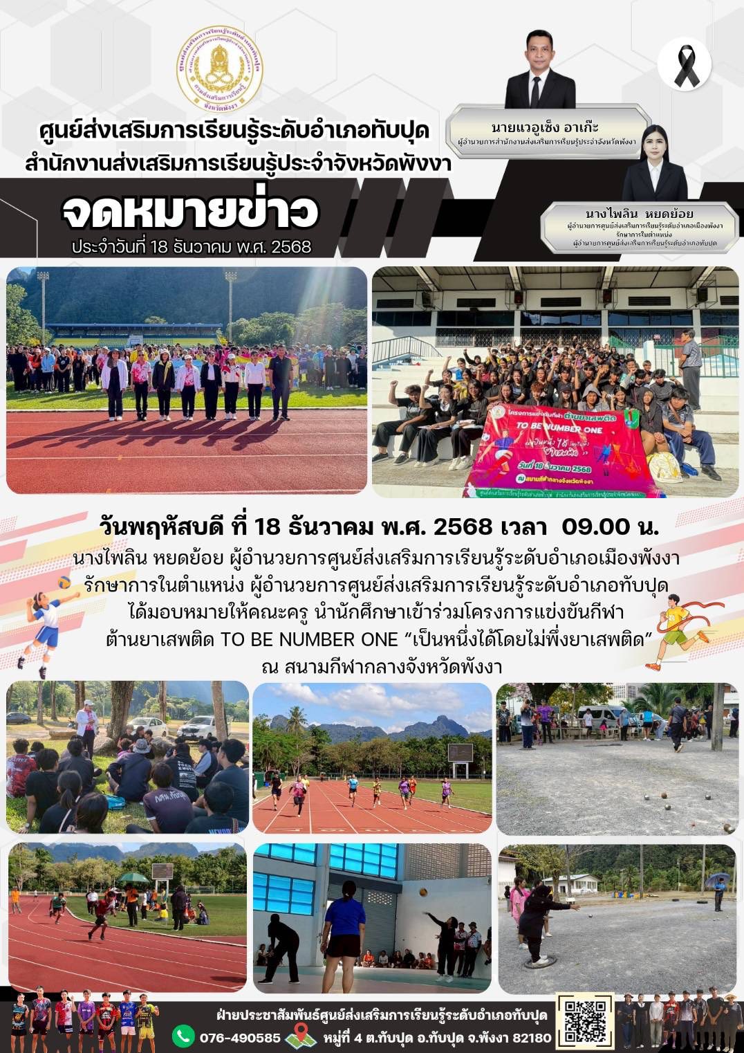 นางไพลิน หยดย้อย ผู้อำนวยการศูนย์ส่งเสริมการเรียนรู้ระดับอำเภอเมืองพังงา รักษาการในตำแหน่งผู้อำนวยการศูนย์ส่งเสริมการเรียนรู้ระดับอำเภอทับปุด ได้มอบหมายให้คณะครู นำนักศึกษาเข้าร่วม โครงการแข่งขันกีฬา ต้านยาเสพติด TO BE NUMBER ONE ภายใต้แนวคิด “เป็นหนึ่งได้โดยไม่พึ่งยาเสพติด”