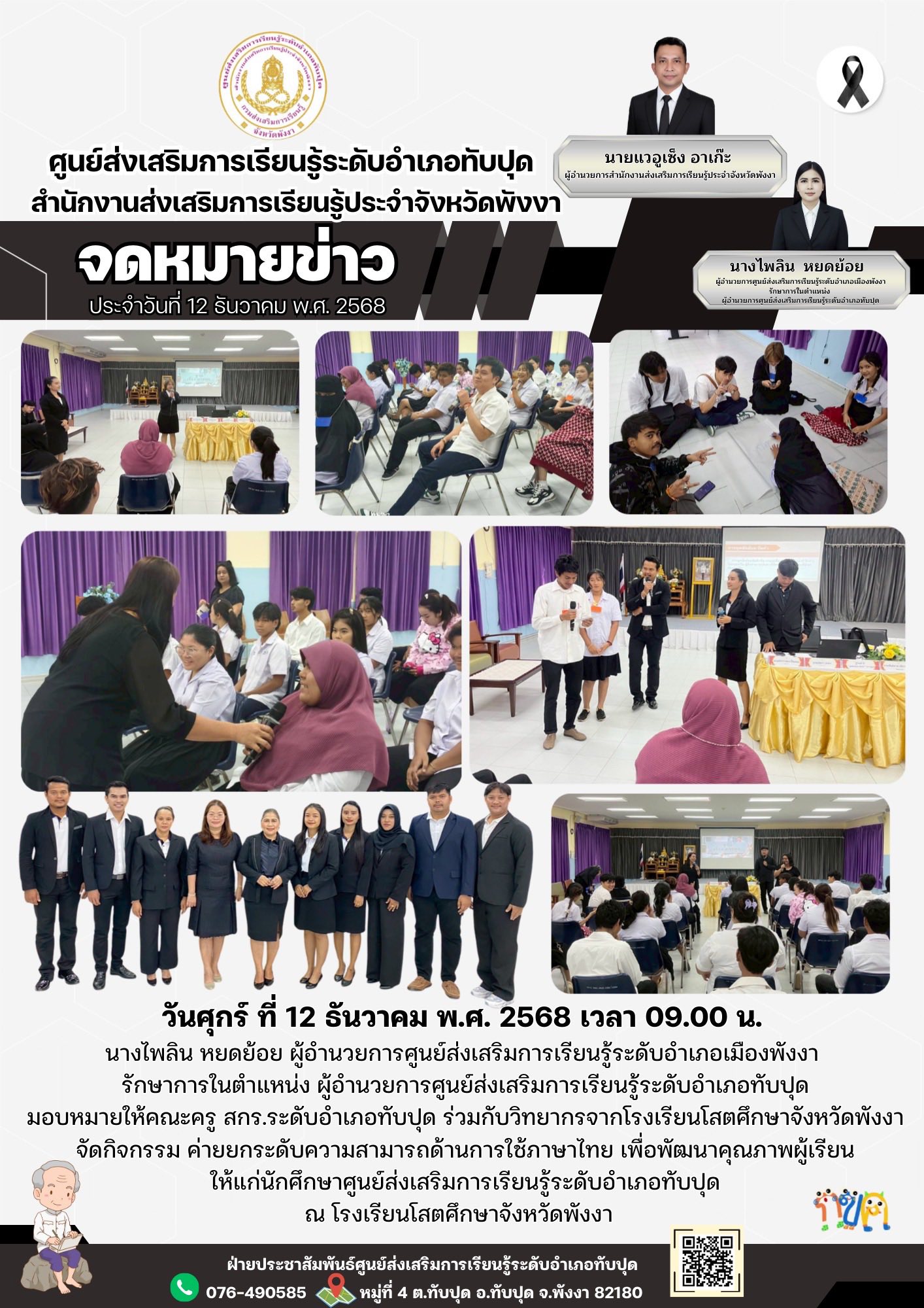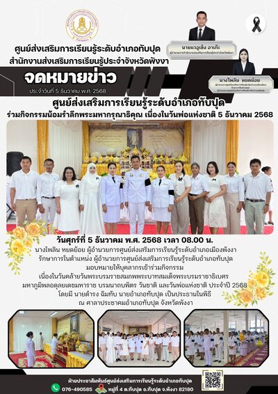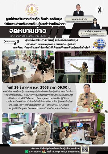วันที่ 12 ธันวาคม พ.ศ. 2568 เวลา 09.00 น. นางไพลิน หยดย้อย ผู้อำนวยการศูนย์ส่งเสริมการเรียนรู้ระดับอำเภอเมืองพังงา รักษาการในตำแหน่งผู้อำนวยการศูนย์ส่งเสริมการเรียนรู้ระดับอำเภอทับปุด