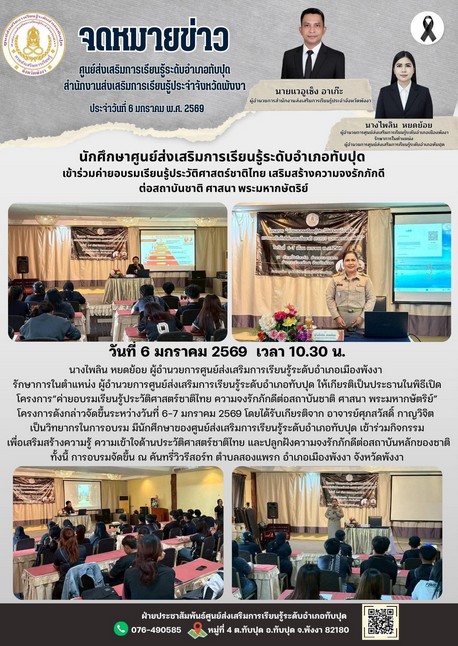 | เข้าร่วมโครงการ "ค่ายอบรมเรียนรู้ ประวัติศาสตร์ชาติไทย ความจงรักภักดีต่อสถาบันชาติ ศาสนา พระมหากษัตริย์" จัดขึ้นระหว่างวันที่ 6-7 มกราคม 2569 ณ คันทรี่วิวรีสอร์ท ตำบลสองแพรก อำเภอเมืองพังงา จังหวัดพังงา |