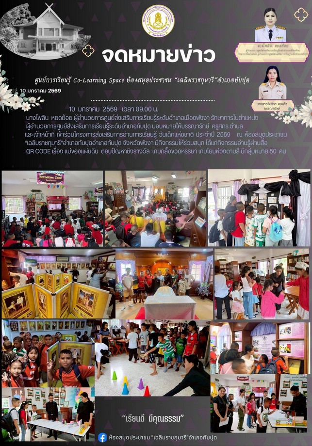 นางไพลิน หยดย้อย ผู้อำนวยการศูนย์ส่งเสริมการเรียนรู้ระดับอำเภอทับปุด ประธานพิธีเปิด โครงการส่งเสริมการอ่าน 2 เมษา วันรักการอ่าน" ห้องสมุดประชาชน "เฉลิมราชกุมารี" อำเภอทับปุด ประจำปี 2568 กิจกรรมประกอบด้วยนิทรรศการเฉลิมพระเกียรติและลงนามถวายพระพร กิจกรรมอ่านบอกรักรวมใจพรรคเรารักกรมสมเด็จพระเทพฯ กิจกรรมระบายรูปภาพจากฝีพระหัตถ์ในสมเด็จพระเทพฯ และมอบเกียรติบัตรสุดยอดนักอ่านและบ้านหนังสือชุมชนดีเด่น โดยมีกลุ่มเป้าหมายเป็นนักเรียนศูนย์พัฒนาเด็กเล็กตำบลบางเหรียง นักเรียน นักศึกษา และประชาชนทั่วไปในพื้นที่ ณ ห้องสมุดประชาชน “เฉลิมราชกุมารี” อำเภอทับปุด จังหวัดพังงา