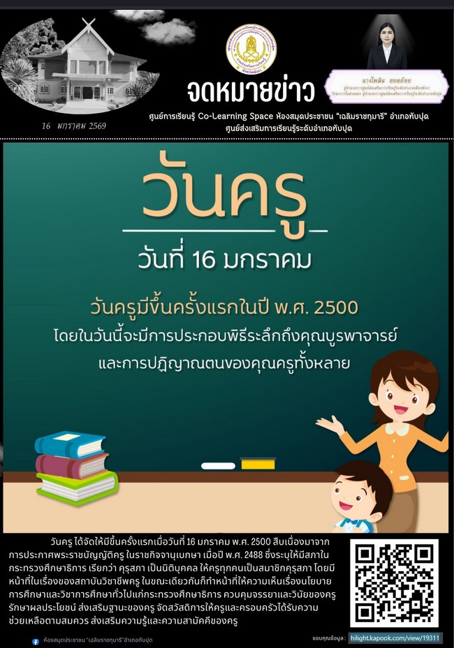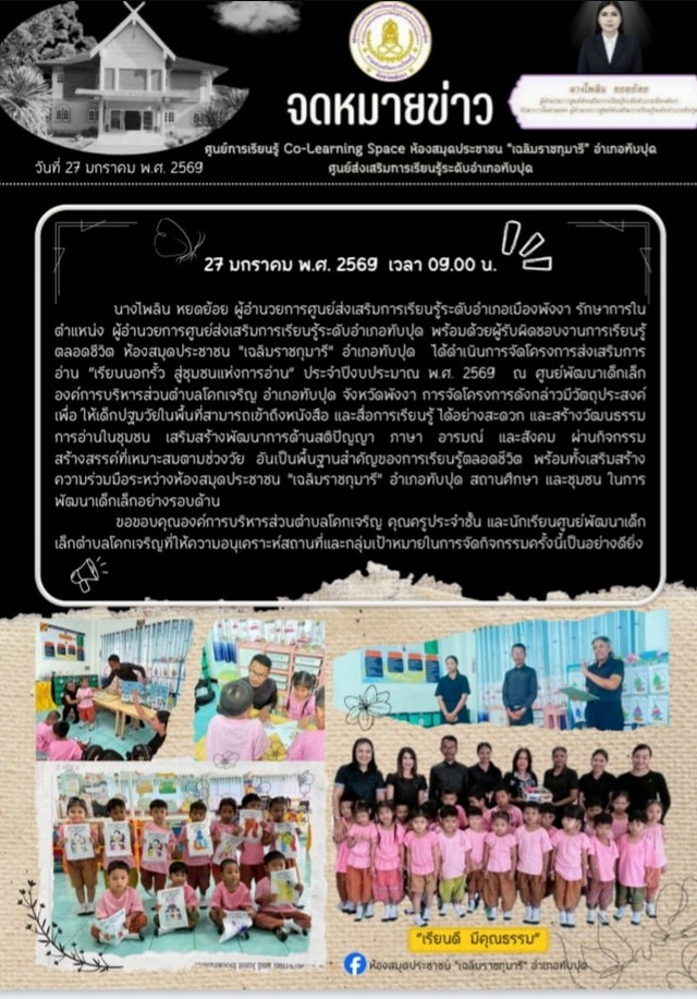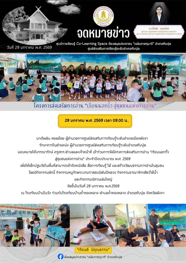 นางไพลิน หยดย้อย ผู้อำนวยการศูนย์ส่งเสริมการเรียนรู้ ระดับอำเภอทับปุด มอบหมายให้บรรณารักษ์ ครู ศกร.ตำบลถ้ำทองหลางและเจ้าหน้าที่ เข้าร่วมโครงการ ส่งเสริมการอ่านสร้างการเรียนรู้ตลอดชีวิต “สำหรับเด็กปฐมวัย" ณ โรงเรียนบ้านในวัง ตำบลถ้ำ ทองหลาง อำเภอทับปุด จังหวัดพังงา มีกิจกรรมให้ร่วมสนุก ได้แก่ กิจกรรมท่องโลกนิทาน กิจกรรม อาณาจักรสัตว์ใต้น้ำ มีกลุ่มเป้าหมายเข้าร่วม จํานวน 30 คน